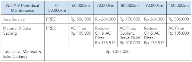 Setelah melewati jarak 60.000 km, konsumen NETA V akan dikenai biaya perawatan sebesar Rp 611.000, pada 70.000 km sebesar Rp 442.515, pada 80.000 km sebesar Rp 1.280.000, pada 90.000 km sebesar Rp 442.515, dan saat mencapai 100.000 km, akan dikenai biaya sebesar Rp 611.000.